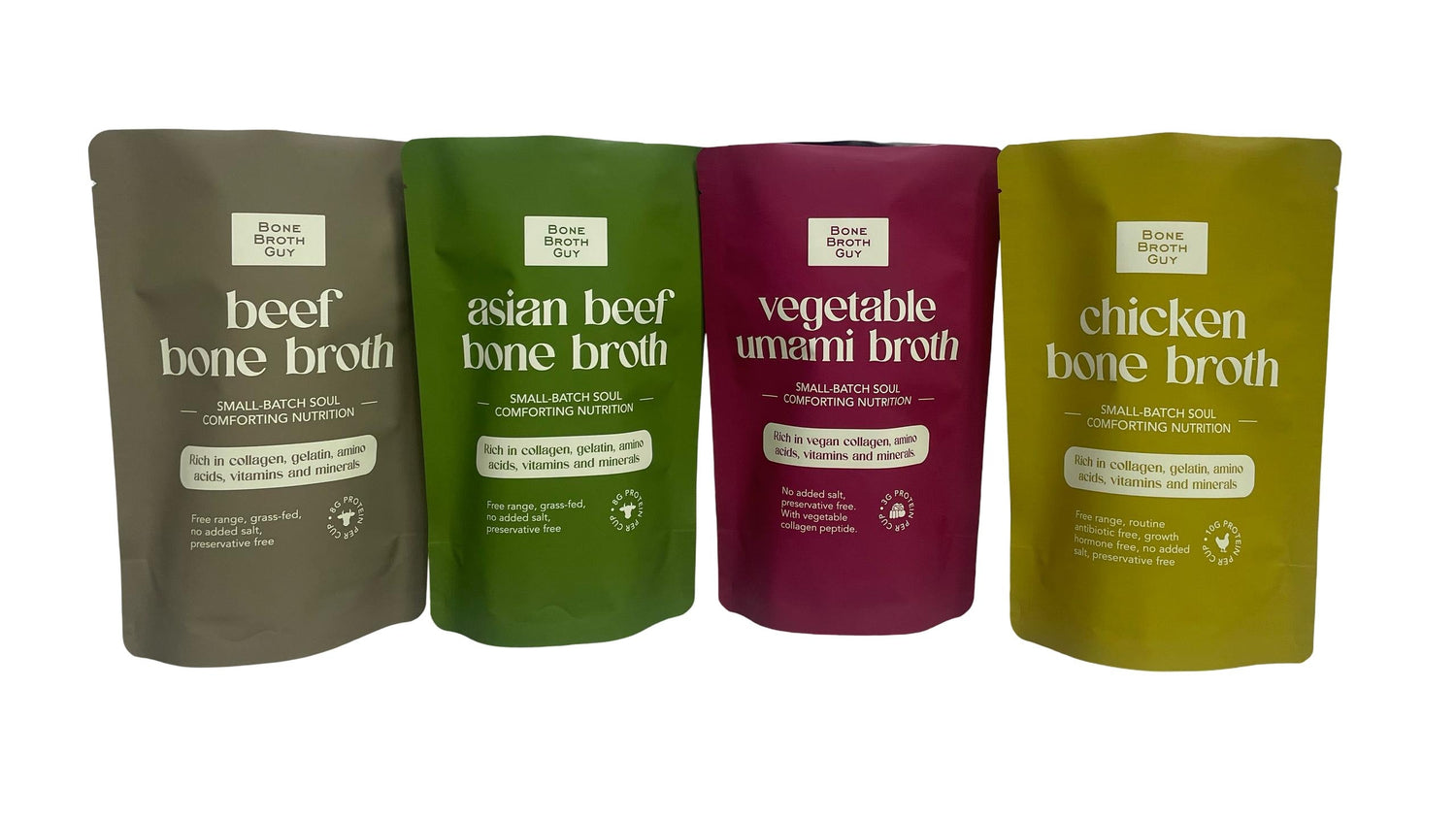 Our bone broth has been cooked for a minimum of 48 hours and free from MSG, is non-GMO and contains no artificial preservatives or added salt.