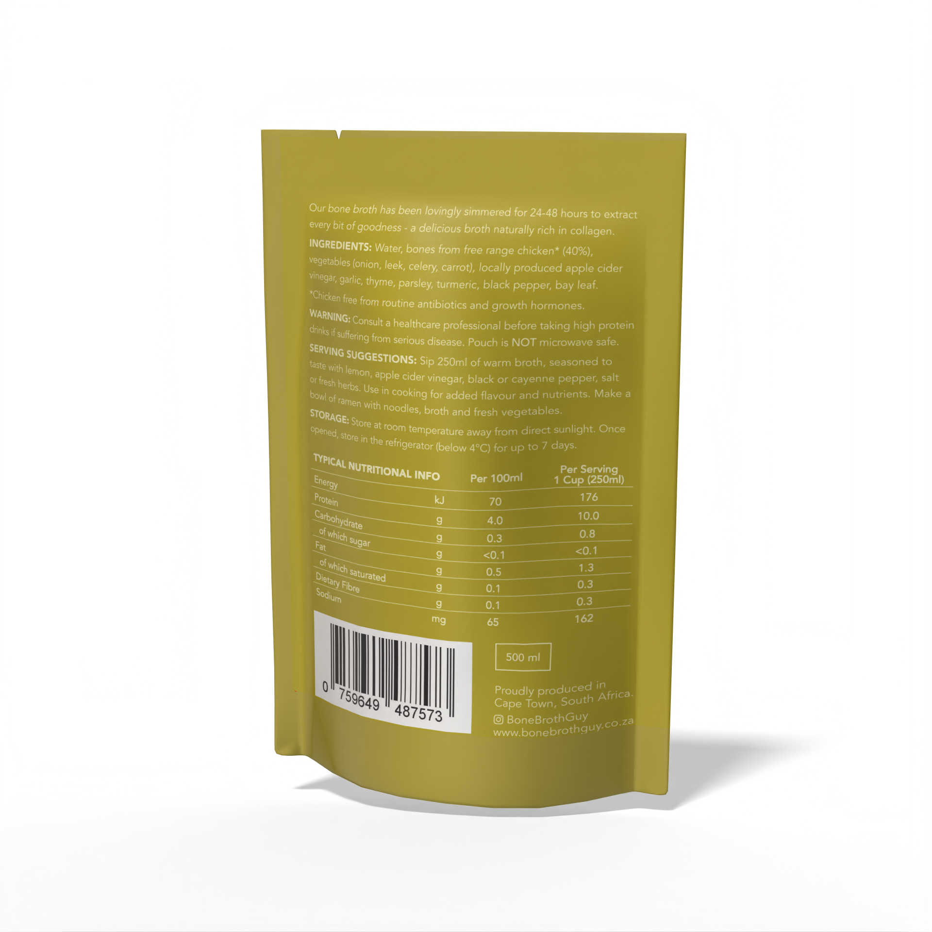Bones from free range chicken* (40%), vegetables (onions, leeks, celery, carrots), locally produced apple cider vinegar, garlic, thyme, parsley, turmeric, black pepper.