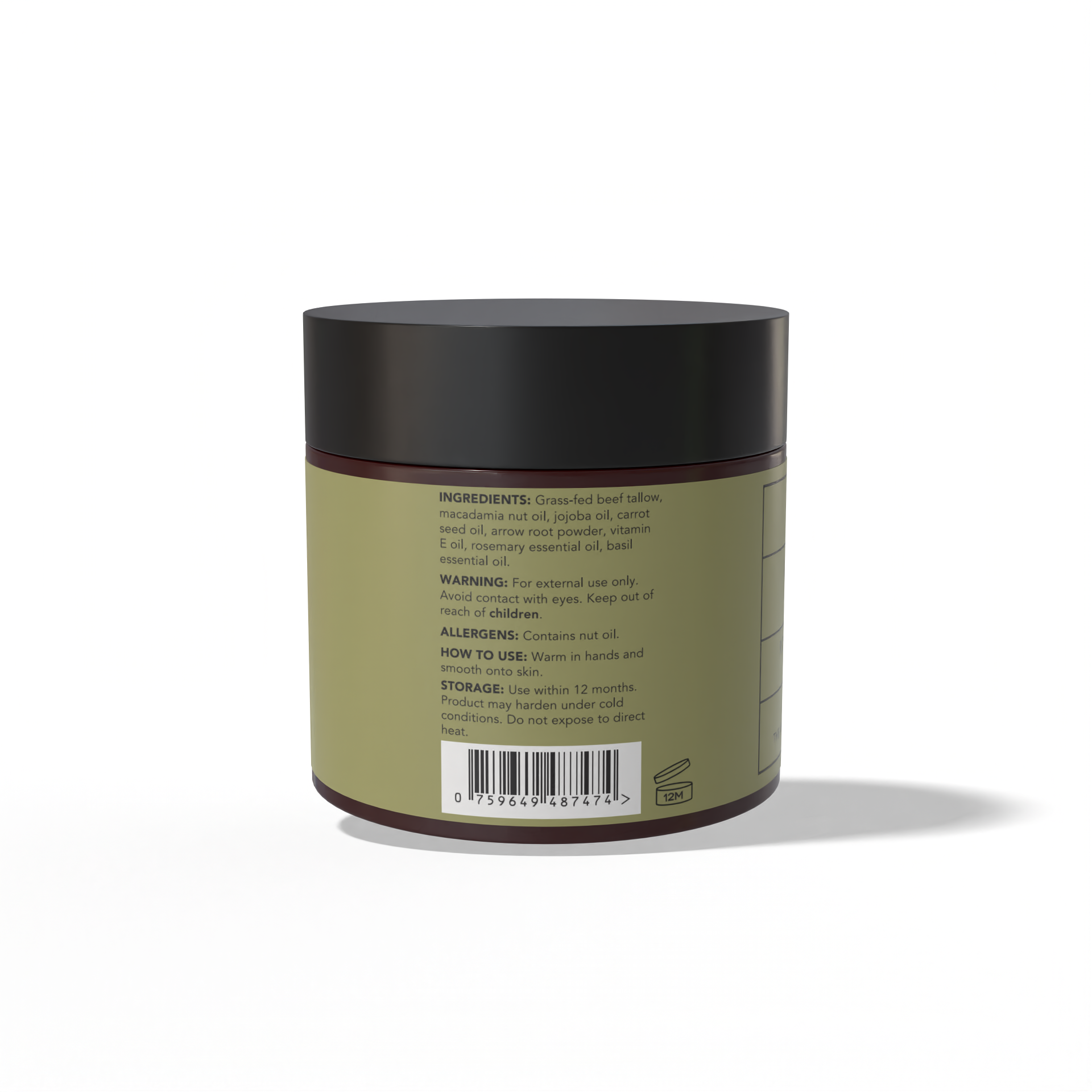 - Grass-Fed Tallow - **Rich in Nutrients**: Contains vitamins A, D, E, and K, which are vital for skin health. - **Moisturizing**: Deeply hydrates the skin due to its high fatty acid content, restoring moisture and reducing dryness. - **Skin Barrier Support**: Mimics the natural fats in human skin, helping to strengthen the skin barrier and prevent moisture loss. - **Anti-Inflammatory**: Can soothe irritated or inflamed skin conditions.